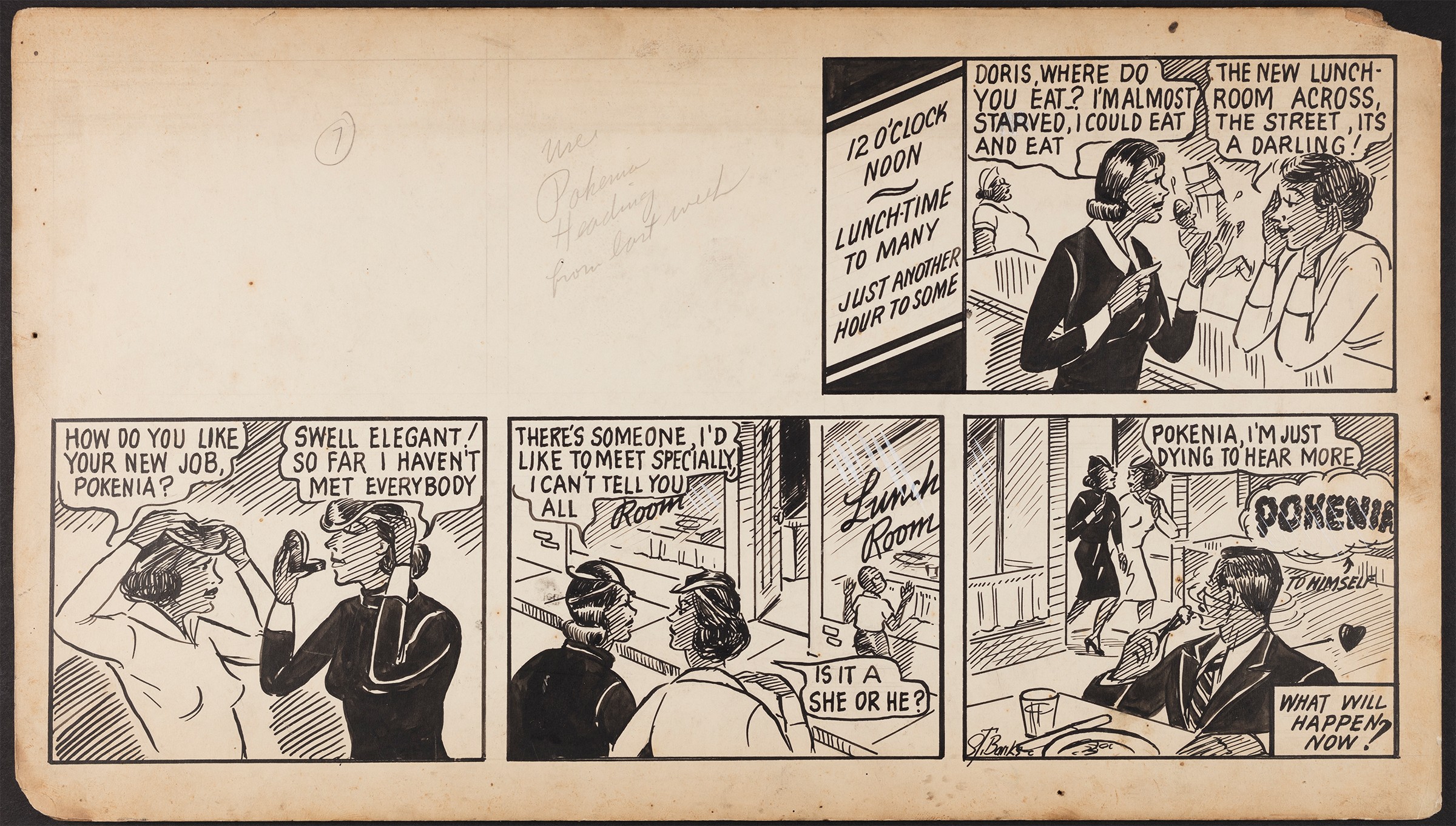 Pokenia was likely the first published newspaper strip to feature a Black woman as its heroine. Banks created the cartoon with collaborator Murry Thompson and set Pokenia in a Black-owned department store, where coworkers Pokenia and Eddie fall in love and have various adventures. Nineteen of Banks’s original ink drawings for the strip are preserved in the Special Collections of Washington University Libraries. Later episodes ran in the Black-owned Argus from September 1939 to May 1940, alongside another strip developed by Banks and Thompson titled Poogie.