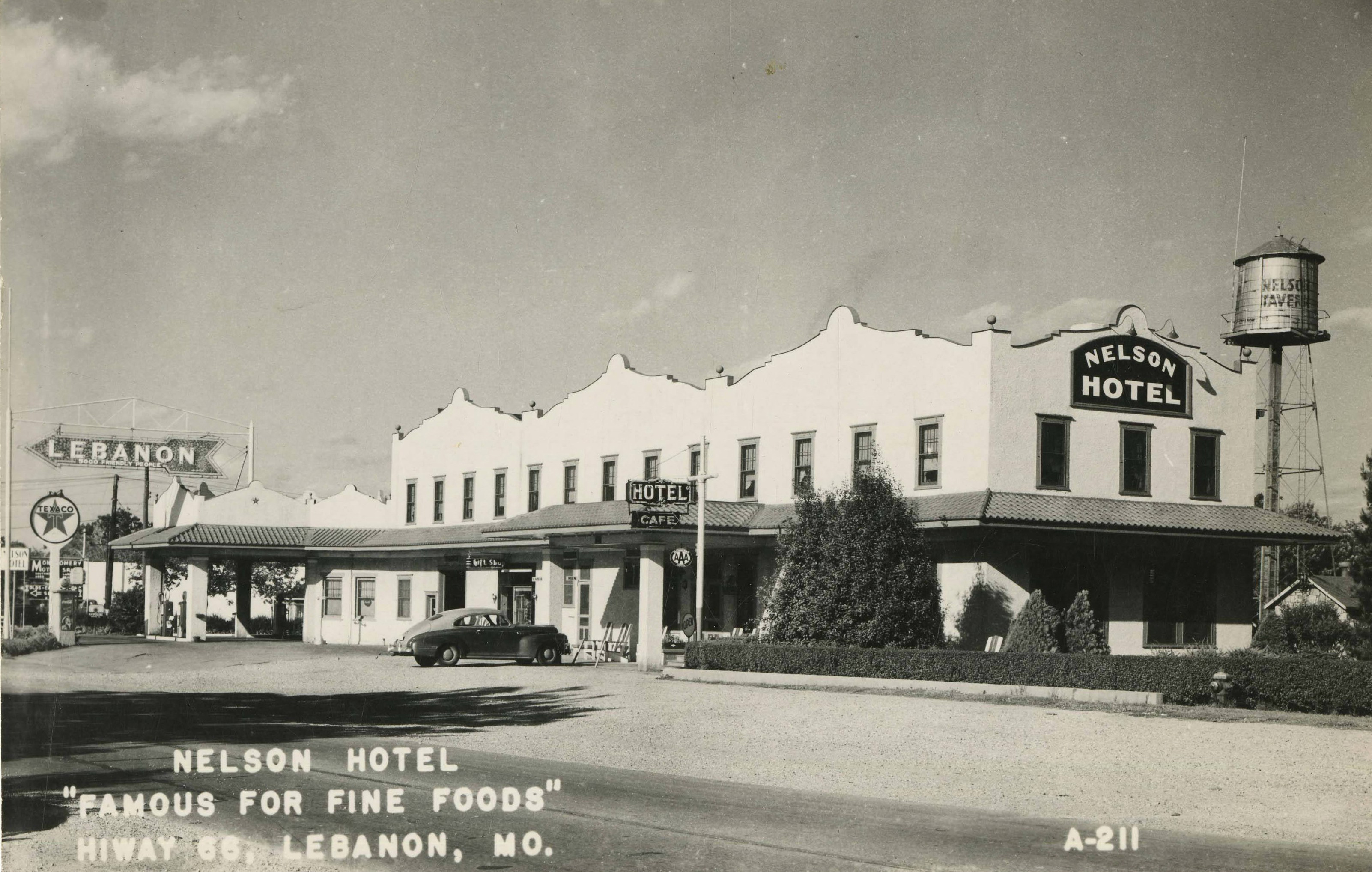 Thus when highway engineers laid out State Highway 14, which preceded Route 66, across Nelson’s orchards south of Lebanon, he did not fight the road. Instead, he donated a portion of his property for the highway. Nelson’s only child, Frank, came up with the idea to open a service station along the new road. The family became pioneers on the new frontier of American roadside commercial culture when, on July 3, 1926, Nelson Service Station and Rest Rooms opened at the intersection of Route 66 and Highway 5. As the number of motorists on the highway increased, the Nelsons opened additional business ventures centered around the service station. They added a hamburger stand, tourist camp with tents and bathhouse, Top o’ the Ozarks Inn café, and eventually twelve cottages. The Nelsons soon demolished the inn and replaced it with a hotel and restaurant, Nelson Tavern, in 1931. The handsome Spanish Revival hotel was indicative of the architectural style’s resurgence in 1920s and 1930s America. The service station was remodeled to match the hotel’s design and to include a modern garage. It was connected to the hotel, where guests could dine, reserve a room, patronize the gift shop, and even visit Arthur Nelson in his private office. As one might expect of a horticultural devotee, the property featured lavish landscaping. During one season alone, fourteen thousand flower bulbs were planted. Gladiolas, peonies, irises, dahlias, and hollyhocks as well as native trees like dogwood and sassafras greeted visitors across the grounds. One Lebanon newspaper dubbed the venture “Nelsonville.”