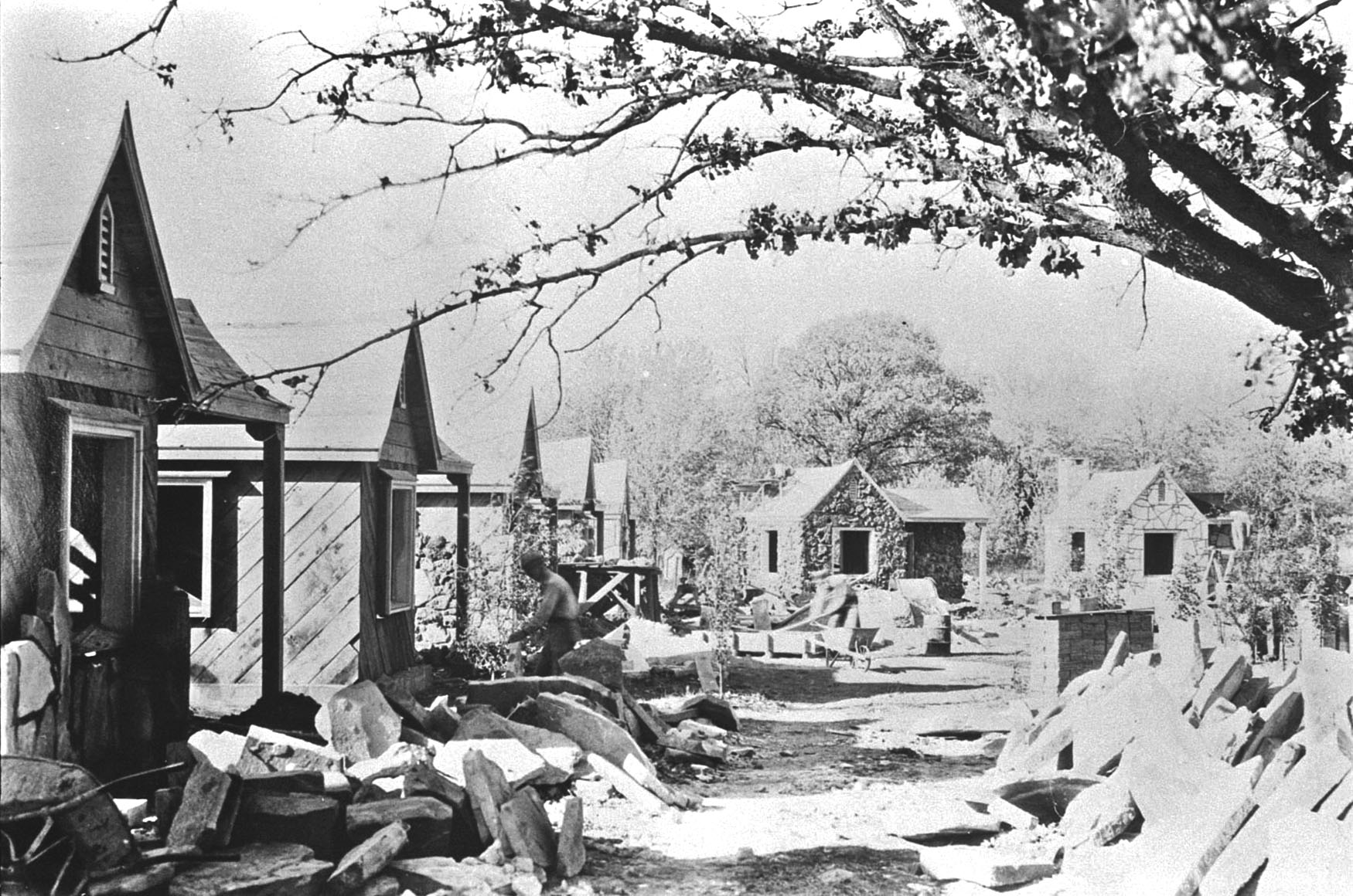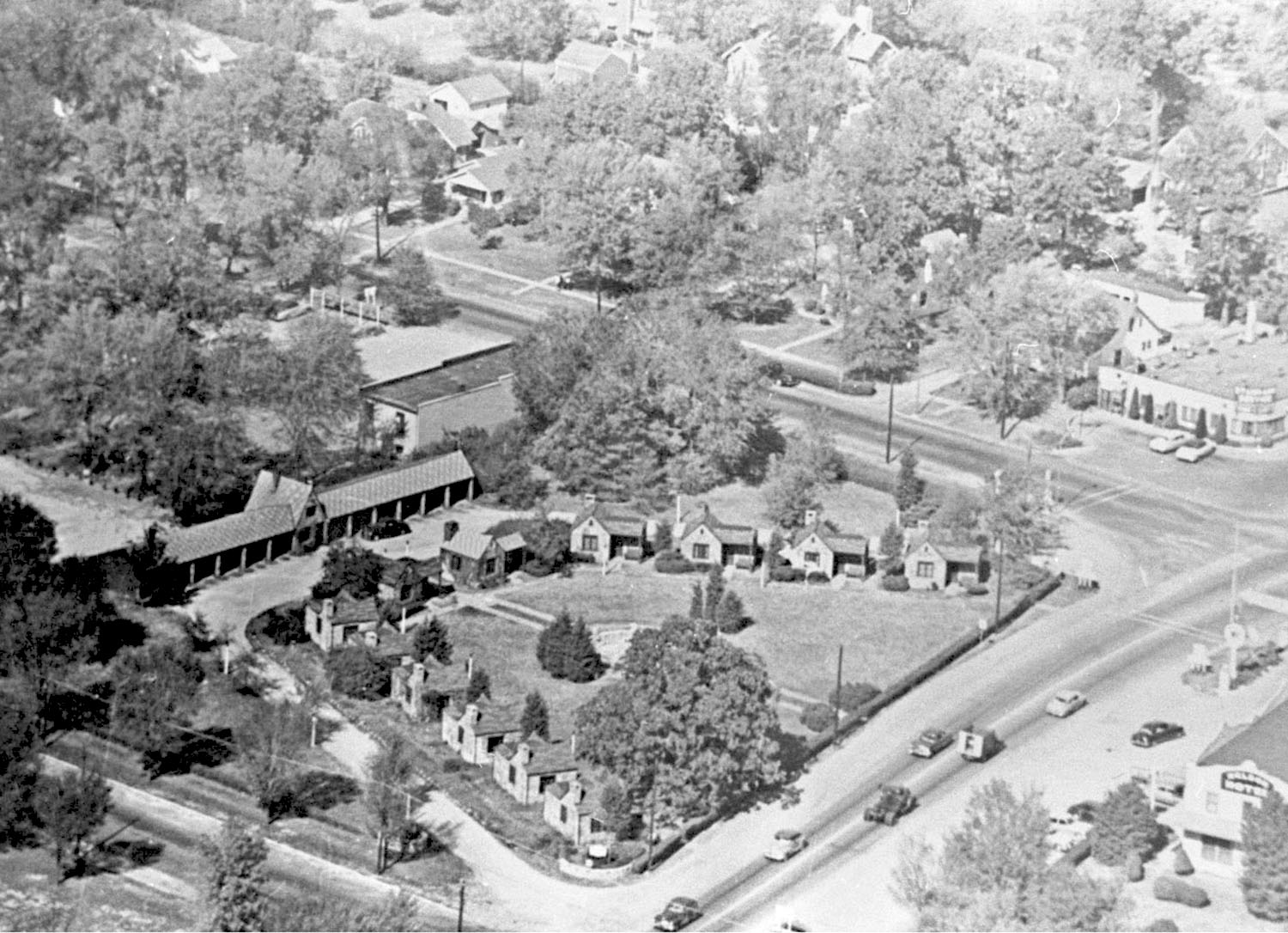 Just as Arthur Nelson experimented with landscape design, he constantly added to and expanded upon the accommodations and services his business offered. In 1934 he sketched a village he envisioned during a dream and immediately sought to make it a reality. “Nelson’s Dream Village,” as it became known, was built across the highway from Nelson Tavern. Twelve one-bedroom cabins, made from carefully selected local rock and stone, were constructed around a landscaped courtyard. At its center was a pool twenty-six feet in diameter with a fountain in the center lit with multicolored lights. For an hour each evening the fountain’s ten individual streams of water would dance to semiclassical and waltz music amidst the twinkling lights. Each cabin was thirteen by thirteen feet with a rock fireplace and chimney as well as a radio. Behind the cabins was a line of twelve individual garages. The business demonstrated Nelson’s willingness to take risks during the depths of the Great Depression.