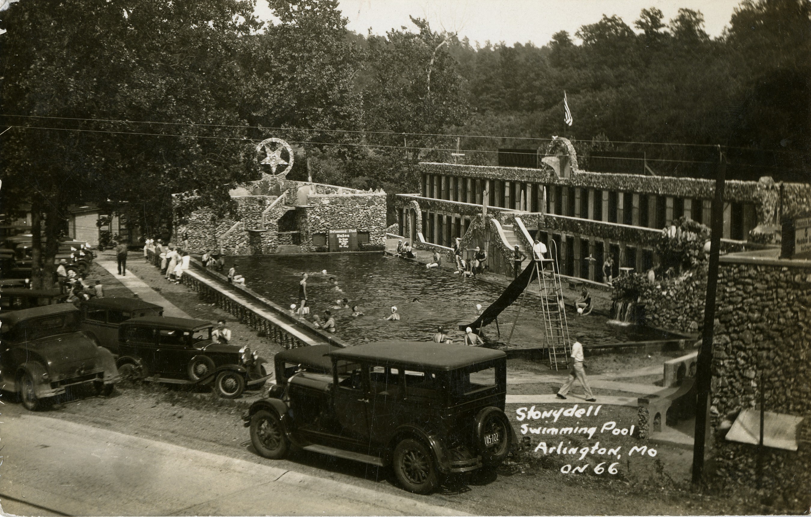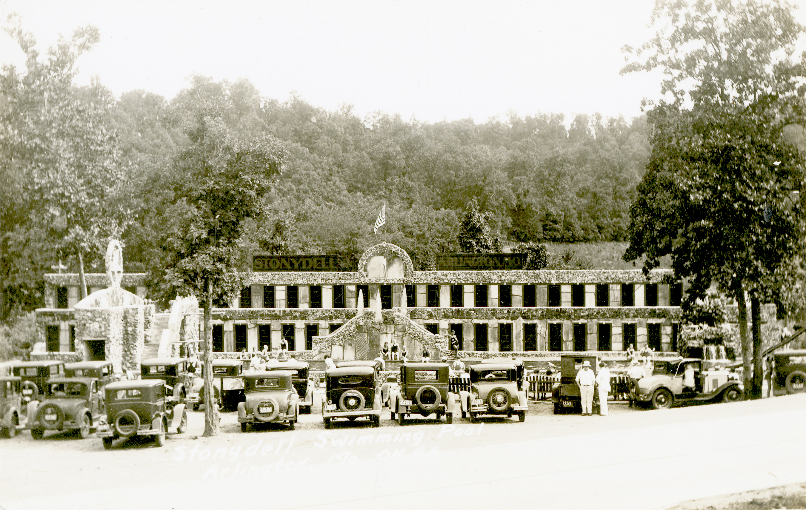 Stony Dell, fourteen miles west of Rolla, was one of the central Missouri Ozarks’ premier tourist destinations on Route 66 during the mid-twentieth century. Built from native rock and stone, the commercial tourist complex’s distinctive façade and swimming pool distinguished it from other contemporary resorts. Historian John F. Bradbury asserted, “the commercial development at Stony Dell was this area’s greatest example of building in native stone. It was meant to be a commercial attraction on the new highway but the combination of swimming pool, restaurant, rock garden, and rustic cabins represented more than just building in stone. It was a work of folk art as well, built in a time when things local were still in vogue.”