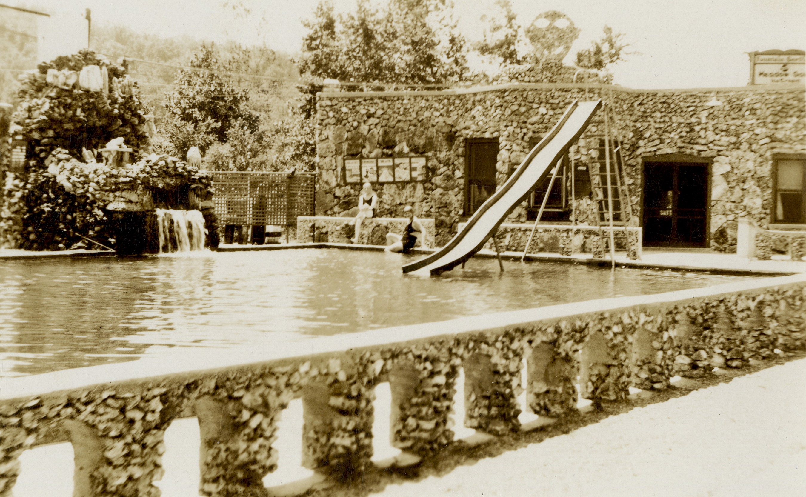 In May 1932, Stony Dell opened to the public. Visitors were greeted by a rustic but charming resort that featured rock cabins, an on-site restaurant, a two-story bathhouse with more than fifty changing rooms, and a concrete swimming pool clad in stone. Freshwater from artisan wells flowed from a large, imposing rock fountain into the pool, which was one hundred feet long, forty-four feet wide, and ranged from three to twelve feet deep. Even though the pool proved popular with locals and travelers alike, Prewett went further by engaging professional divers for public exhibitions. Admission was fifty cents for adults and thirty-five cents for children. Despite the crowds, there were no published reports of anyone drowning at Stony Dell, which is remarkable given that the pool held hundreds of swimmers on busy weekends, making it easy for a struggling swimmer to go unnoticed.